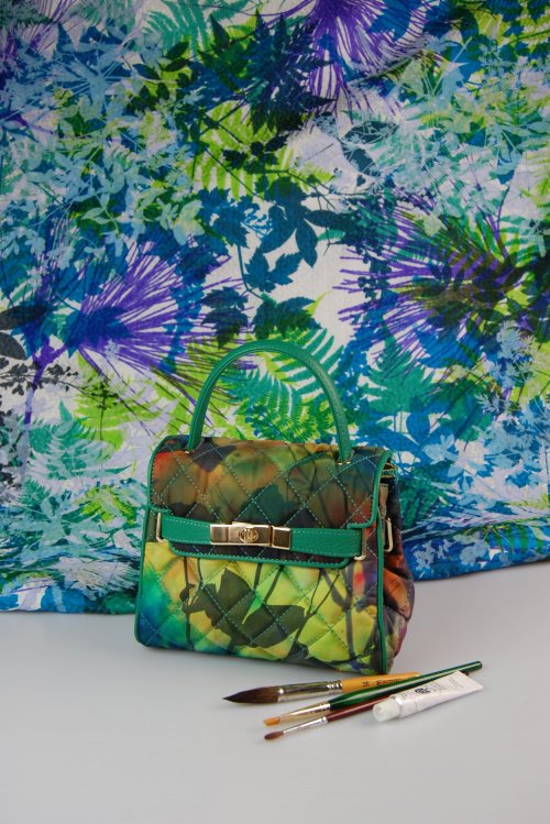 In vera pelle e seta pura 100% dipinta a mano – monotipo (pezzo unico) realizzata dalla Prof.ssa Angela Maria Scarparo con tecniche pittoriche che impossibilitano la ripetitività della decorazione.